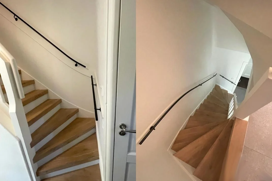 Wenn du deine Treppe im Konfigurator für gebogene Geländer auswählst, weiß Teus genau, wie die Geländer gebogen werden müssen. Dieses Treppengeländer-Set wird dann sorgfältig gebogen, sodass die Stahlgeländer der Lauflinie deiner Treppe folgen.