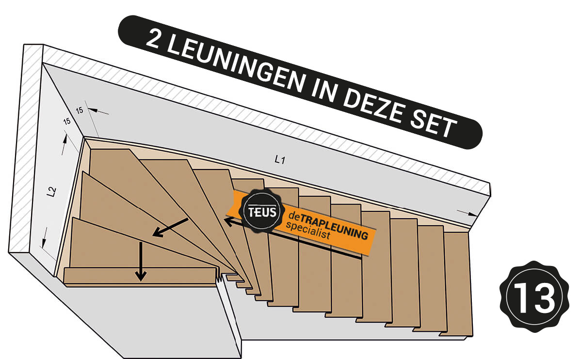 Da ein Treppentyp ausgewählt wurde, weiß Teus genau, wie und wo der Handlauf gebogen werden muss. Daher ist es nicht notwendig, komplizierte Maße anzugeben! Teus wird die Handläufe so biegen, dass sie der Lauf­linie der Treppe folgen.