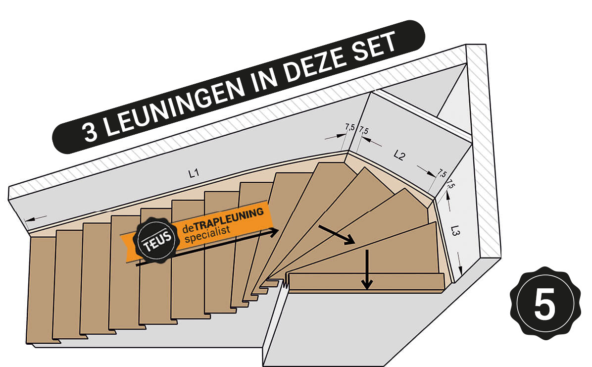 Da ein Treppentyp ausgewählt wurde, weiß Teus genau, wie und wo der Handlauf gebogen werden muss. Daher ist es nicht notwendig, komplizierte Maße anzugeben! Teus wird die Handläufe so biegen, dass sie der Lauf­linie der Treppe folgen.