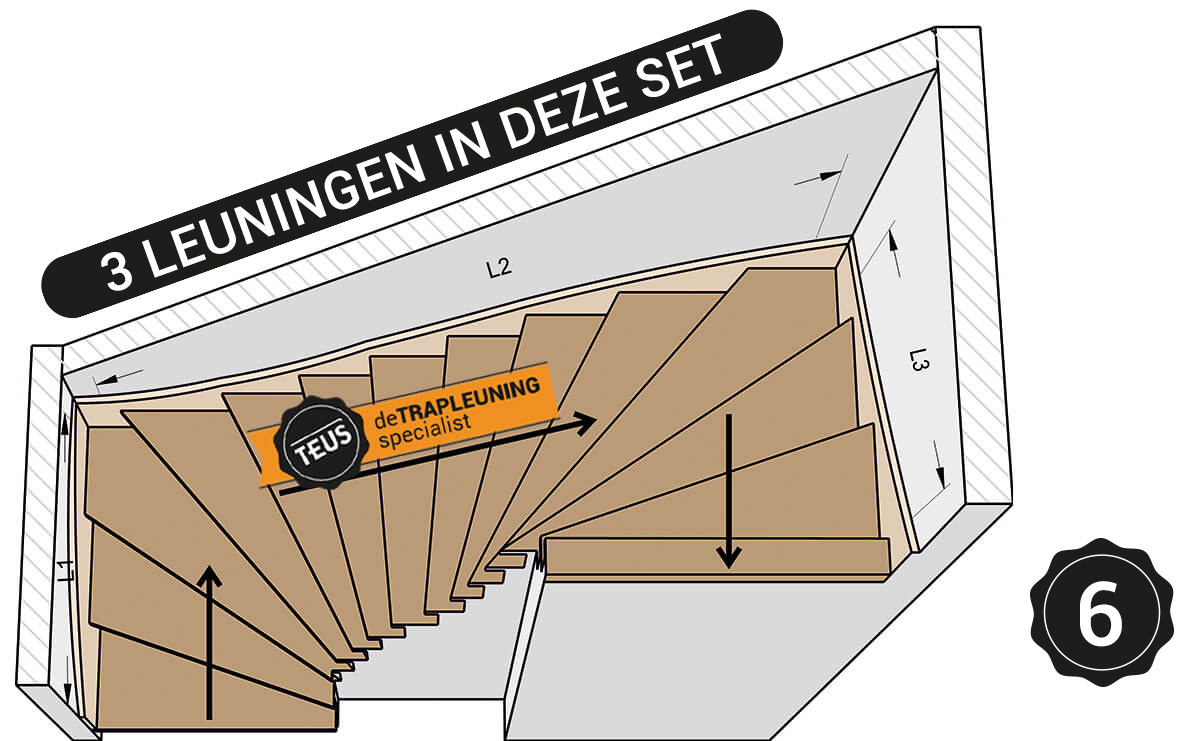 Da ein Treppentyp ausgewählt wurde, weiß Teus genau, wie und wo der Handlauf gebogen werden muss. Daher ist es nicht notwendig, komplizierte Maße anzugeben! Teus wird die Handläufe so biegen, dass sie der Lauf­linie der Treppe folgen.
