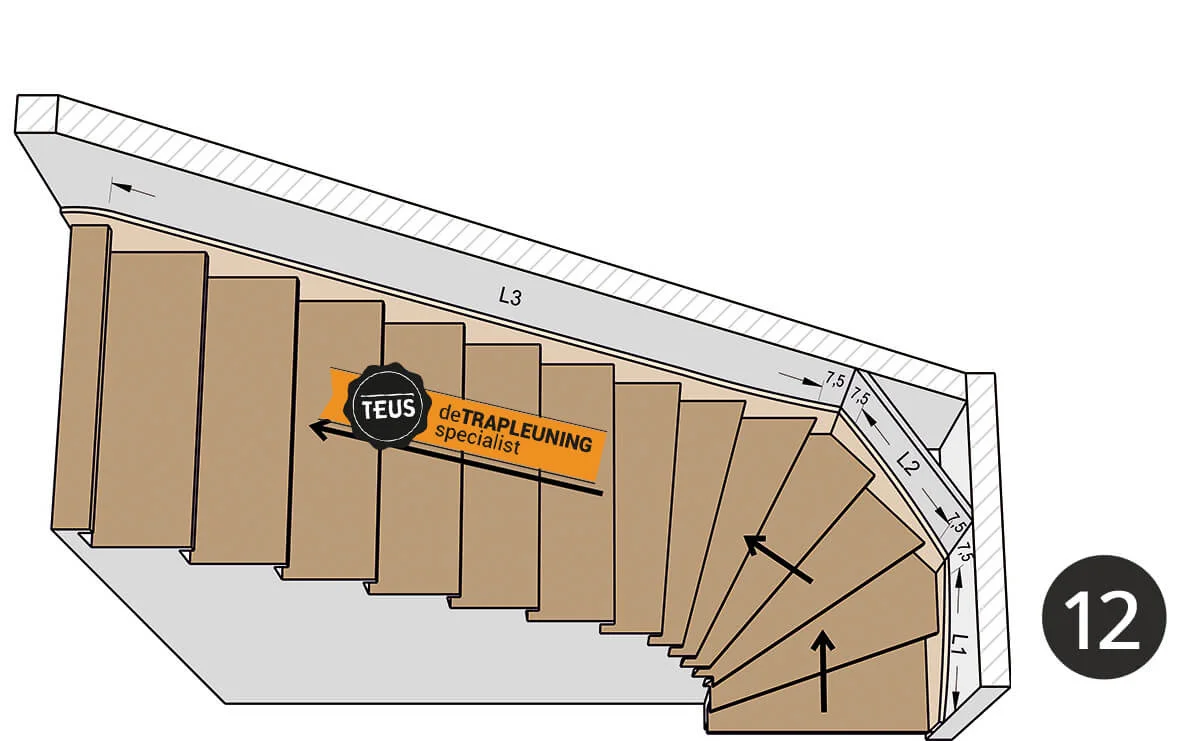 Wenn du deine Treppe im Konfigurator für gebogene Geländer auswählst, weiß Teus genau, wie die Geländer gebogen werden müssen. Dieses Treppengeländer-Set wird dann sorgfältig gebogen, sodass die Stahlgeländer der Lauflinie deiner Treppe folgen.