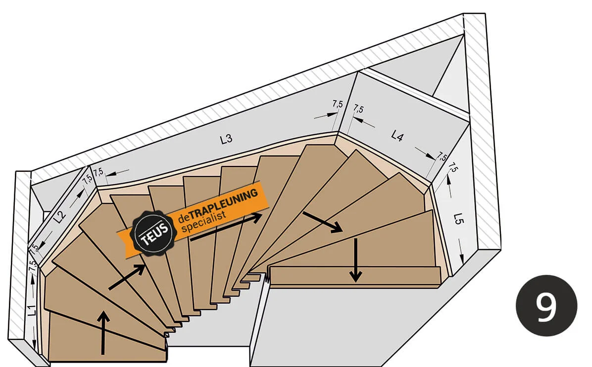 Wenn du deine Treppe im Konfigurator für gebogene Geländer auswählst, weiß Teus genau, wie die Geländer gebogen werden müssen. Dieses Treppengeländer-Set wird dann sorgfältig gebogen, sodass die Stahlgeländer der Lauflinie deiner Treppe folgen.