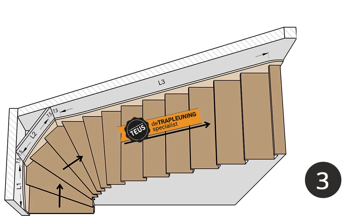 Wenn du deine Treppe im Konfigurator für gebogene Geländer auswählst, weiß Teus genau, wie die Geländer gebogen werden müssen. Dieses Treppengeländer-Set wird dann sorgfältig gebogen, sodass die Stahlgeländer der Lauflinie deiner Treppe folgen.