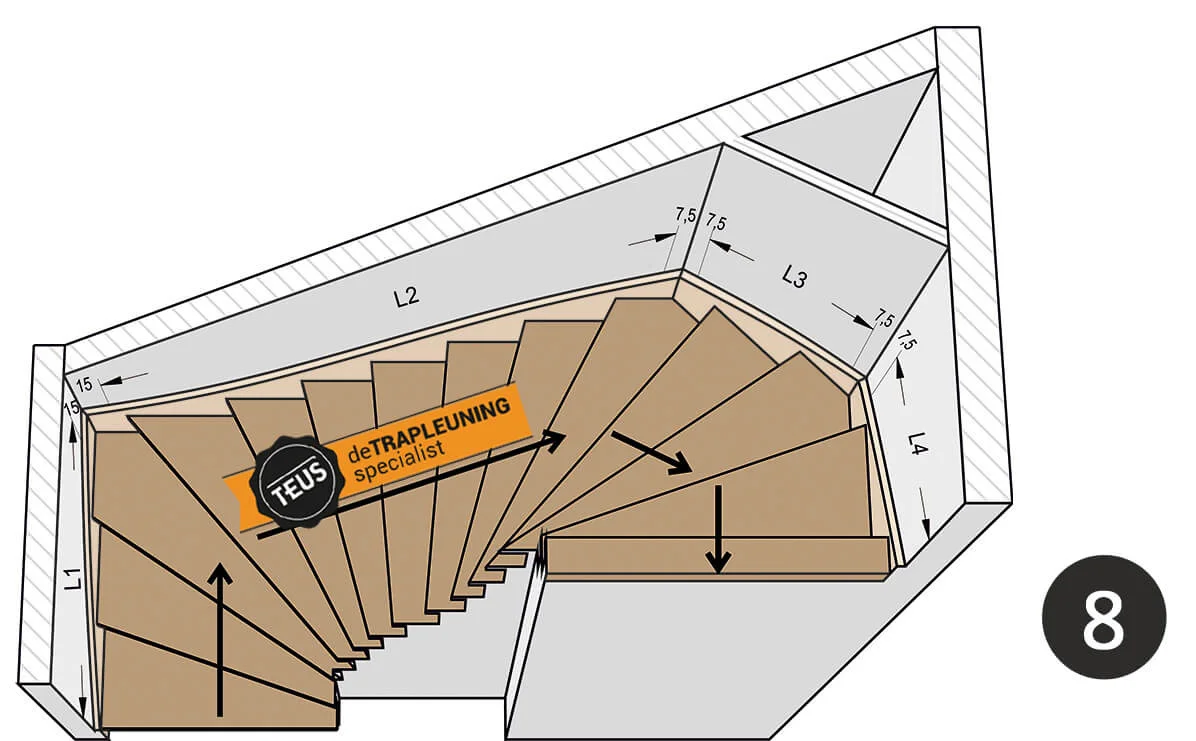 Wenn du deine Treppe im Konfigurator für gebogene Geländer auswählst, weiß Teus genau, wie die Geländer gebogen werden müssen. Dieses Treppengeländer-Set wird dann sorgfältig gebogen, sodass die Stahlgeländer der Lauflinie deiner Treppe folgen.