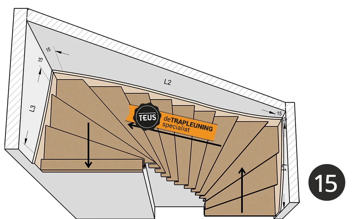 Da ein Treppentyp ausgewählt wurde, weiß Teus, wie und wo das Geländer gebogen werden muss, sodass keine komplizierten Maßangaben erforderlich sind! Teus wird die Geländer so biegen, dass sie dem Verlauf der Treppe folgen. Müssen die Geländer nach bestimmten Normen gebogen werden, kann dies gegen einen Aufpreis ausgeführt werden.