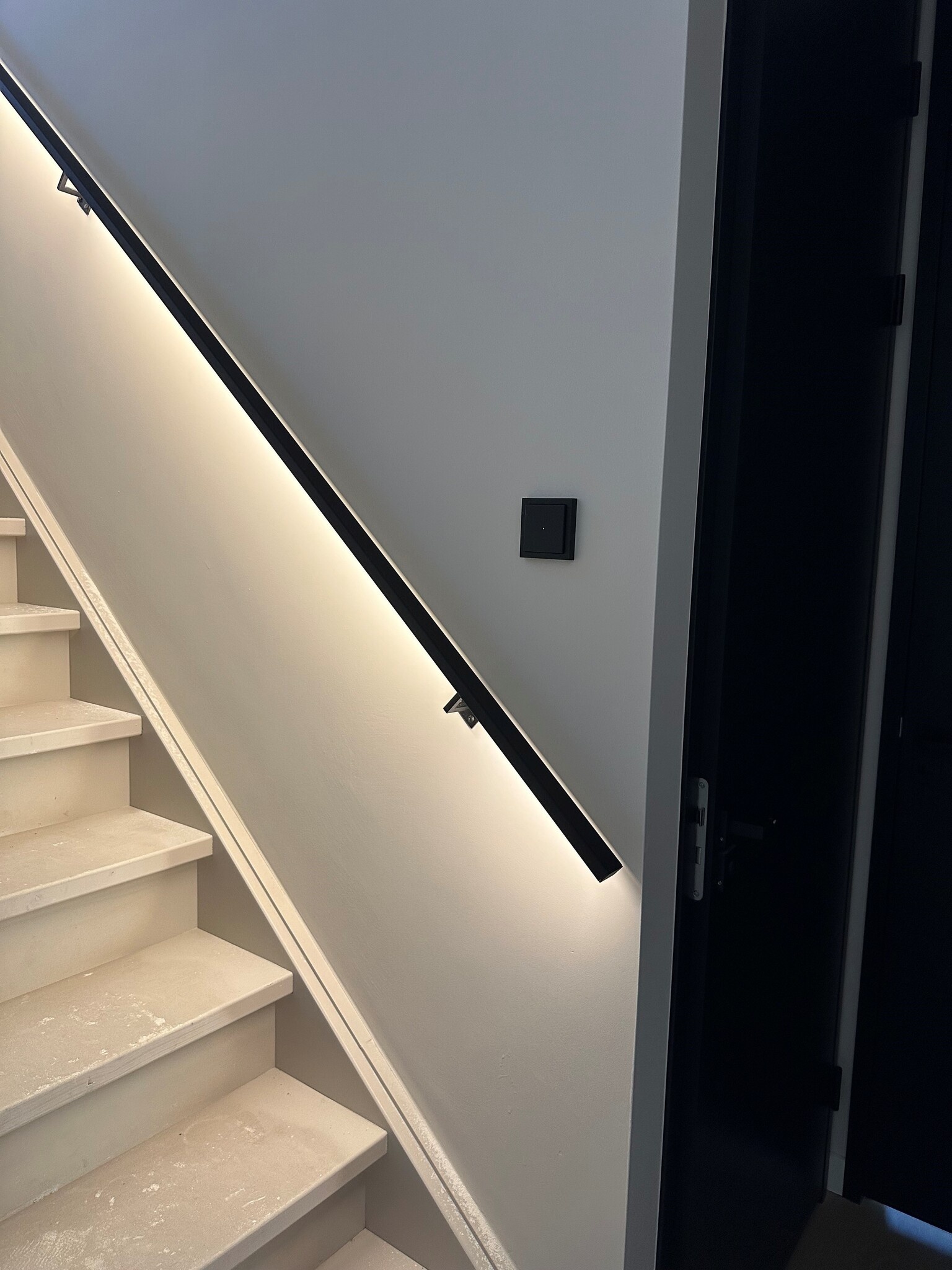 Dieser schwarze Handlauf mit durchgehender LED-Linie bietet neben seinem wunderschönen Aussehen genügend Grip, um die Treppe sicher zu betreten. Außerdem ist es eine sichere Idee, dass die Treppe vollständig durch diesen beleuchteten Handlauf erhellt wird. Die warmweiße Beleuchtung ist natürlich besonders stimmungsvoll und der Handlauf zudem sehr langlebig. Die extrem harte, matt schwarze Pulverbeschichtung hat zwei besondere Eigenschaften. Die Pulverbeschichtung hat eine sehr feine Struktur, sodass der Handlauf nicht glatt anfühlt, und sie ist zudem schmutzabweisend. Die Verkabelung, die die 12-Volt-LED-Linie speist, wird ordentlich durch einen hohlen Handlaufhalter geführt, der 15 cm von einer Stirnseite montiert wird. Dieses Niederspannungskabel ist ca. 1 bis 5 Meter lang und wird an den LED-Treiber (12-Volt-Netzteil) angeschlossen. Wo nötig, kann dieses Kabel einfach nach Belieben verlängert werden. Teus empfiehlt, das (LED-Treiber-)Netzteil im Sicherungskasten, unter der Treppe oder auf der anderen Wandseite, durch die das Stromkabel geführt wird, zu platzieren. Von diesem Punkt aus wird ein Niederspannungskabel zum ersten oder letzten Handlaufhalter benötigt. Selbstverständlich wird der schwarze Handlauf komplett geliefert, inklusive Handlaufhaltern, schwarzen Schrauben und LED-Treiber (Netzteil). Plug & Play also!