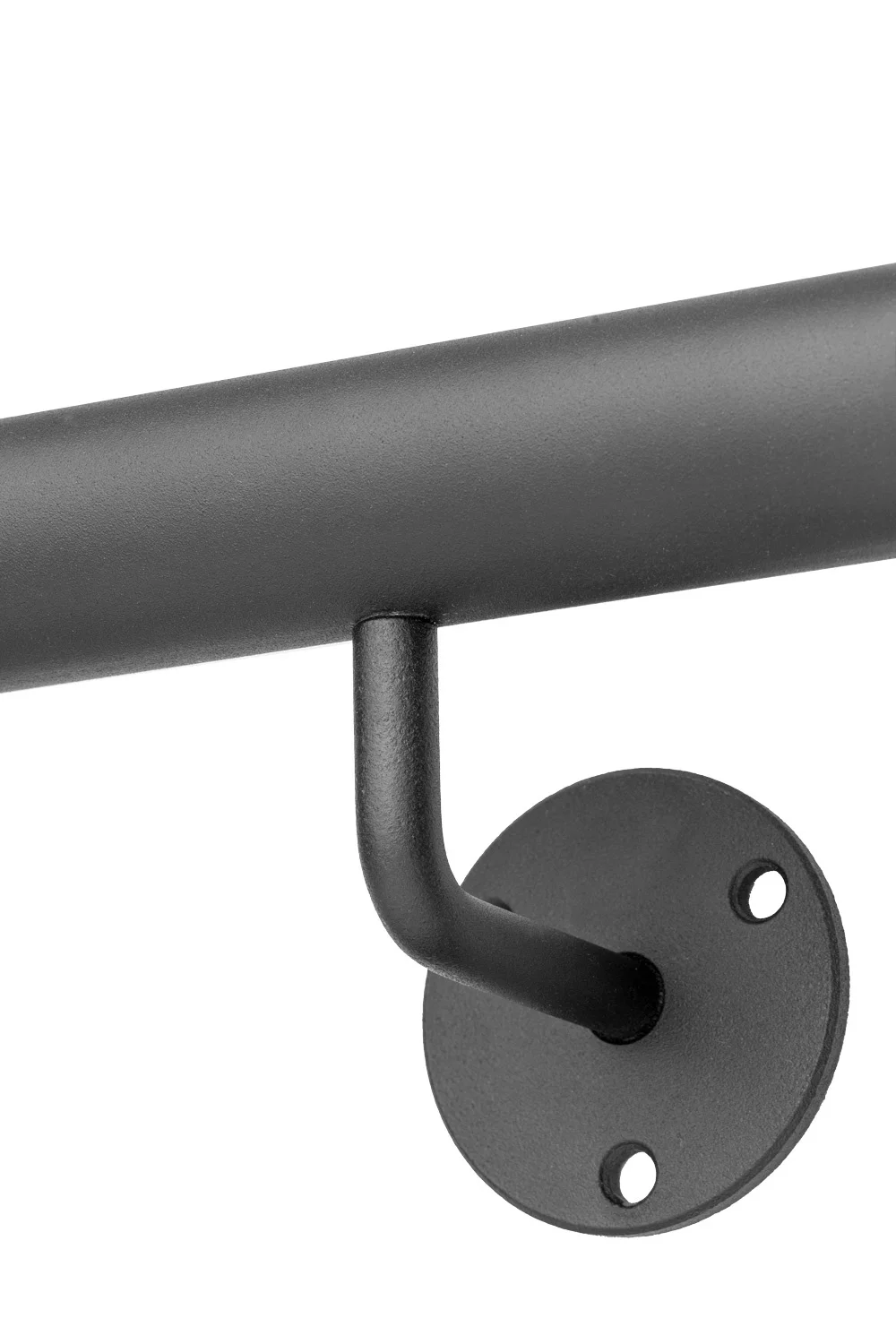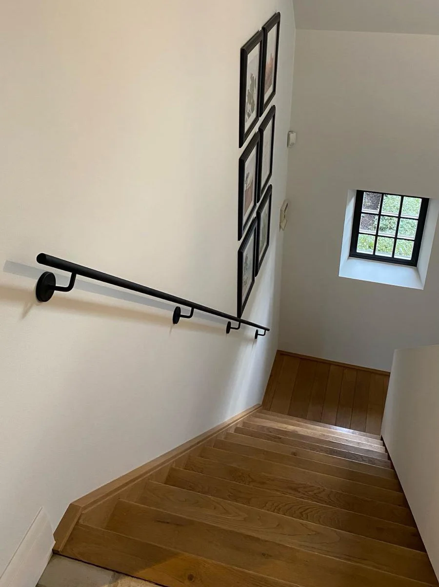 Das Geländer und die Handlaufhalter werden in einer mattschwarzen Pulverbeschichtung mit feiner Antirutschstruktur geliefert, was für besonders guten Halt sorgt, sodass du dich auch mit feuchten Händen sicher am Geländer festhalten kannst. Alle Befestigungsmaterialien werden mitgeliefert, mit Ausnahme der Dübel.